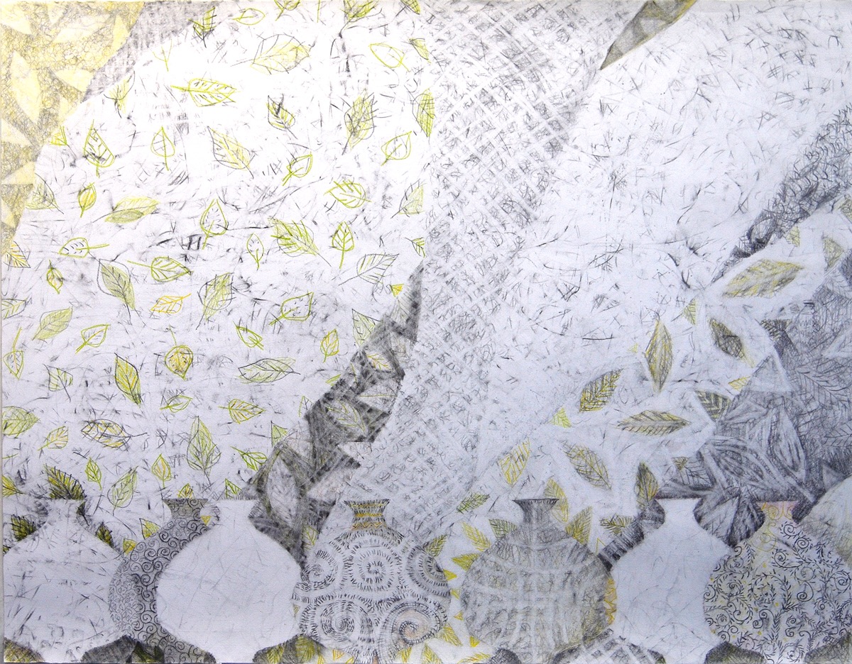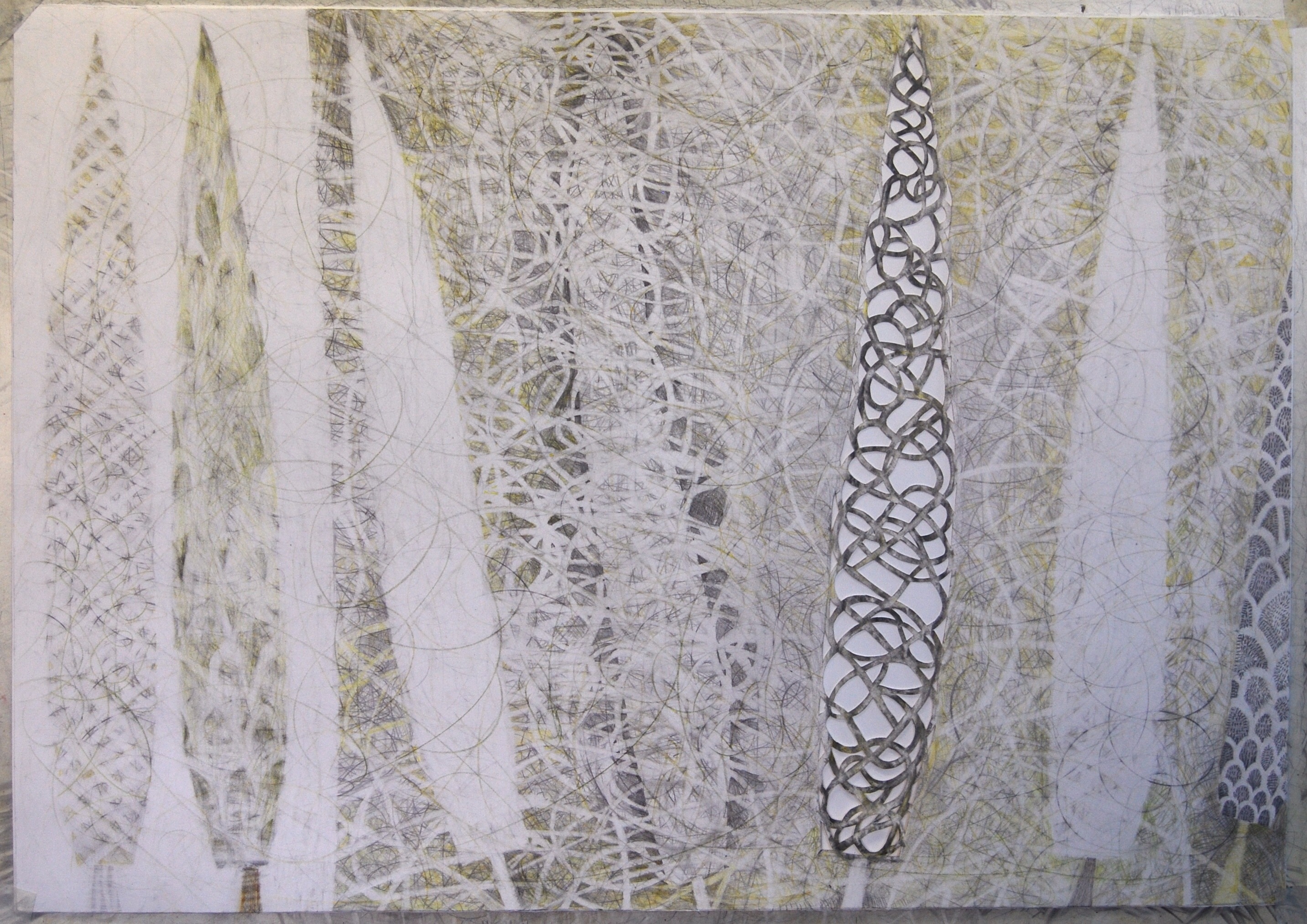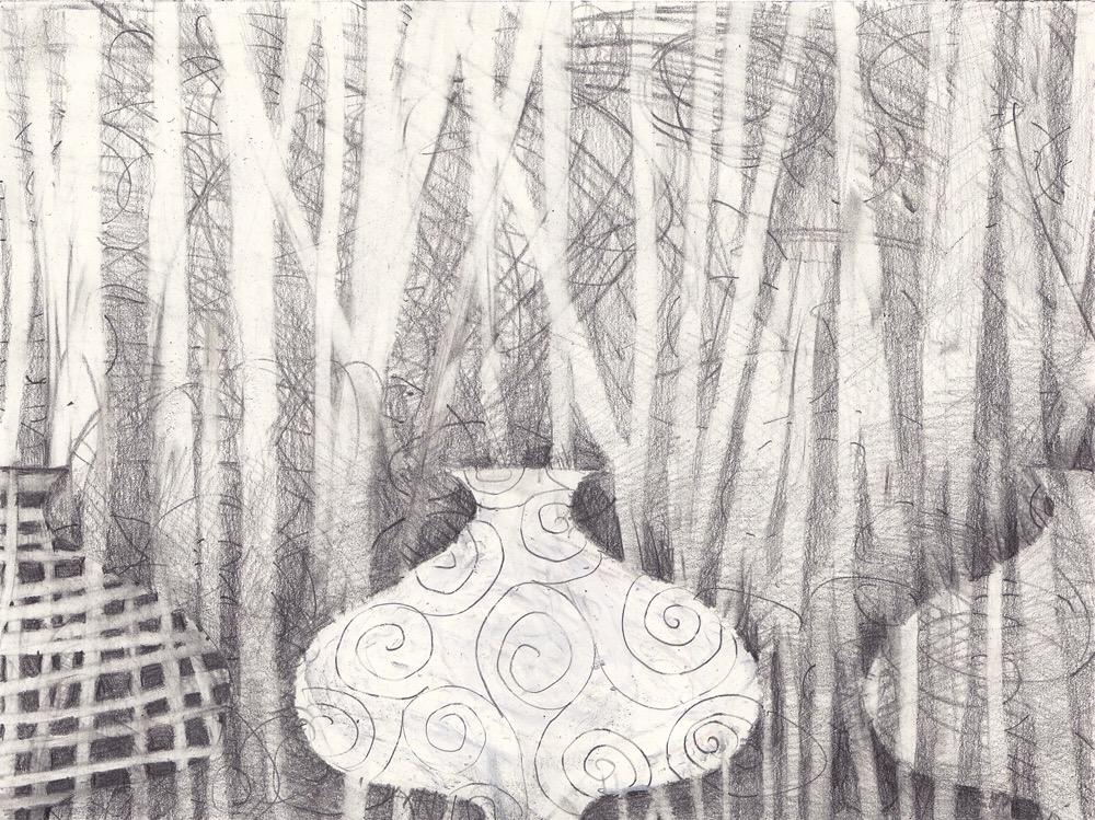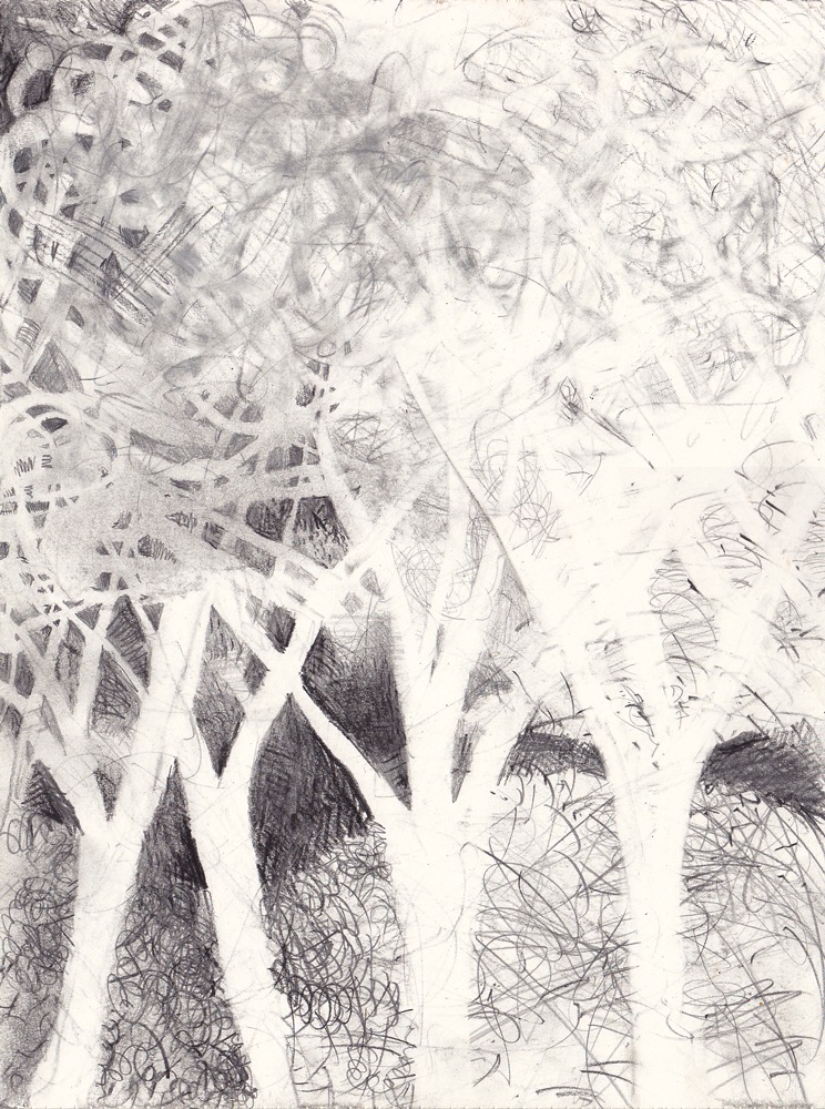 My goal was to investigate ways to use plain old graphite to make color, and especially how to use the white of the paper as a primary subject matter. Therefor, I stuck with my familiar old images, trees and bottles. (I also did many abstracts, but the figurative works were more inventive.)