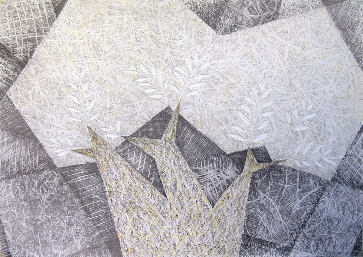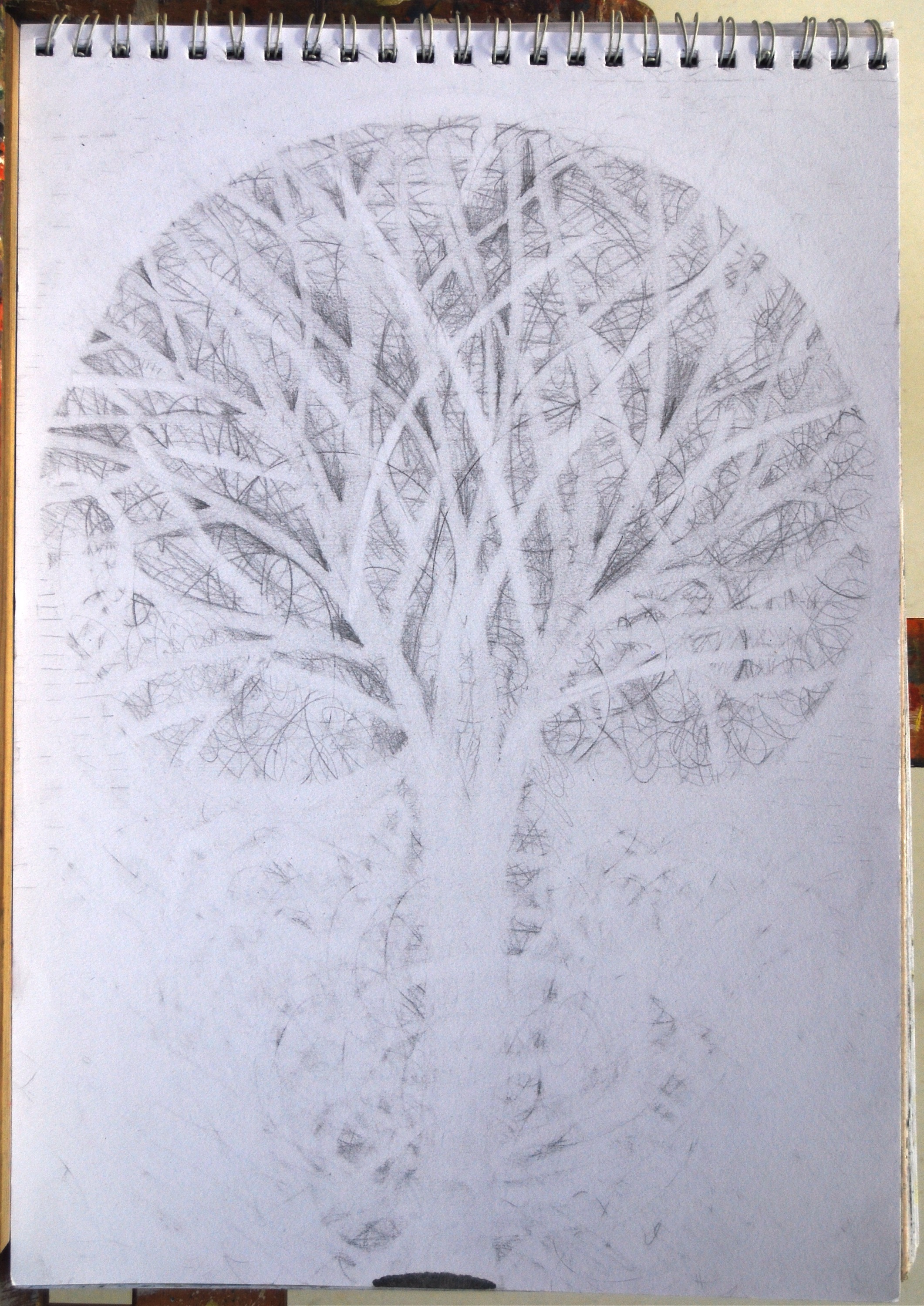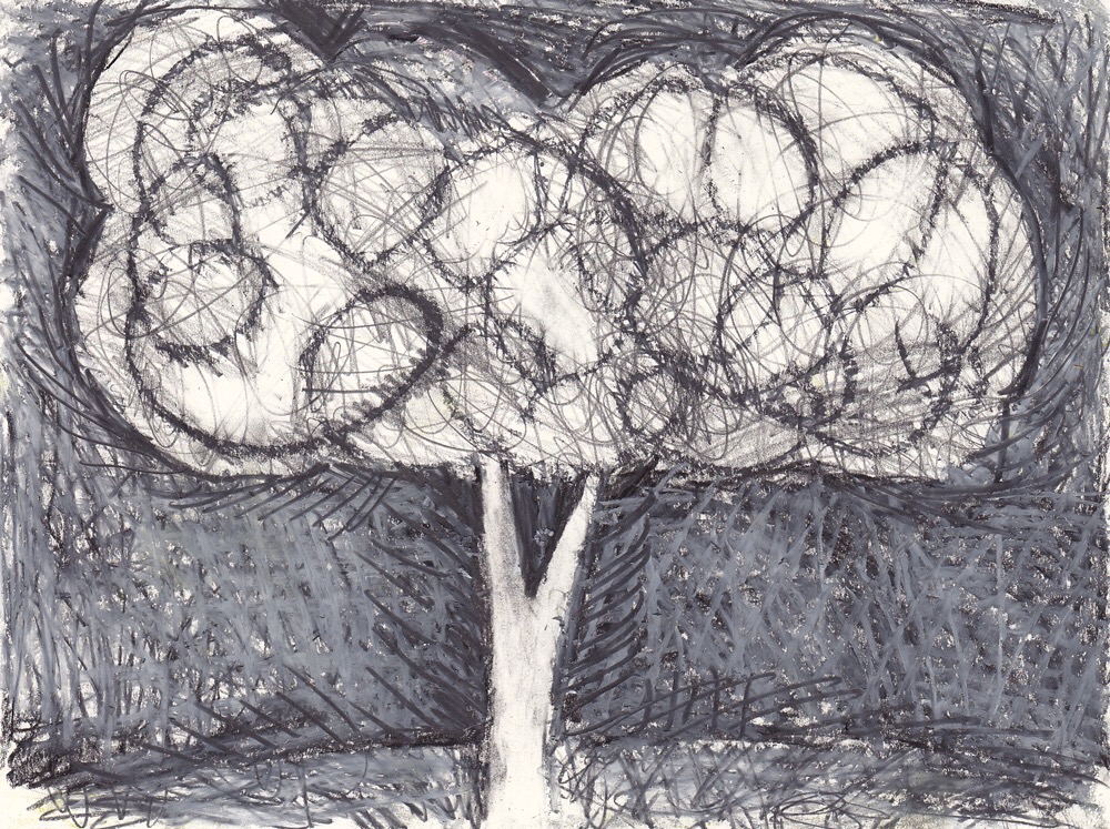 My goal was to investigate ways to use plain old graphite to make color, and especially how to use the white of the paper as a primary subject matter. Therefor, I stuck with my familiar old images, trees and bottles. (I also did many abstracts, but the figurative works were more inventive.)
