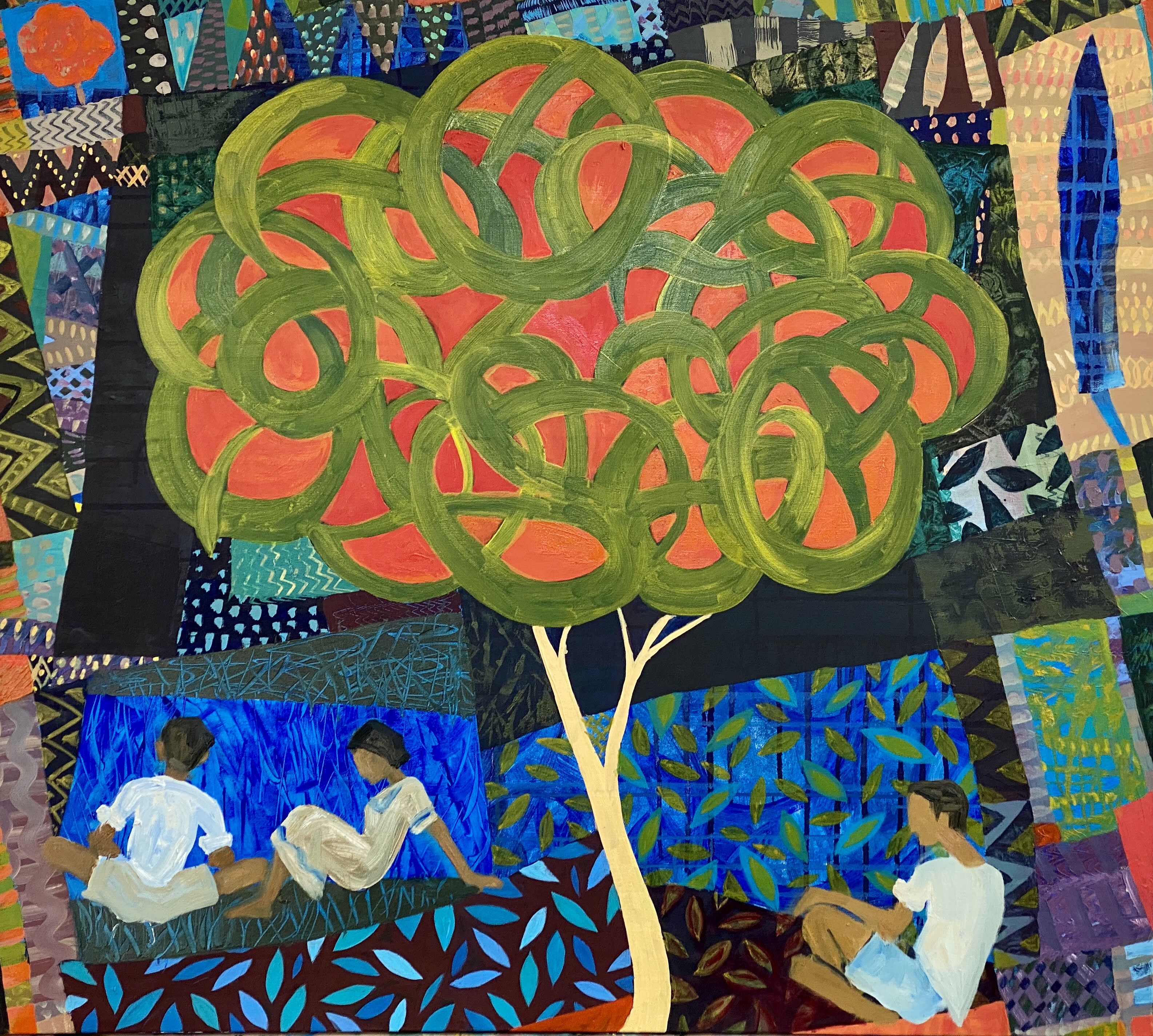 I worked and reworked this canvas for years. It began with a plan to create a painting entirely in shades of white. Soon a tree entered. Followed by yellows and my beloved weird greenish “dark yellows” joined. (They arecreated by adding a drop of black into various lemons and flame colors.